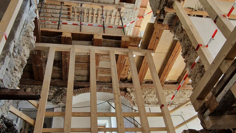 Tragkonstruktion: Bestehende Konstruktion mit ergänzenden Stahlbeton-Bauteilen durch den neuen Aufzugschacht im Bestand. Dieser wurde durch Mikropfähle auf den tragenden Grund verankert. Verbesserung der Tragkonstruktion im Gebäude durch neue Stahlträger/ Wände/ Decken.